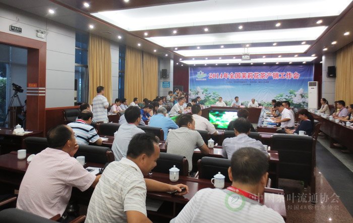 8月23日下午,2014年全国茉莉花茶产销工作会在县委第一会议室举行。中国茶叶流通协会常务副会长王庆,南宁市委常委、横县县委书记李振林,横县政协主席陈保金,以及来自四川犍为、福建福州等茉莉花茶主产区政府的领导,张一元、吴裕泰、猴王茶业、福建茶叶进出口公司茉莉花茶龙头企业,社会各界媒体等120余人出席了本次产销工作会。会议由中国茶叶流通协会常务副秘书长姚静波主持。