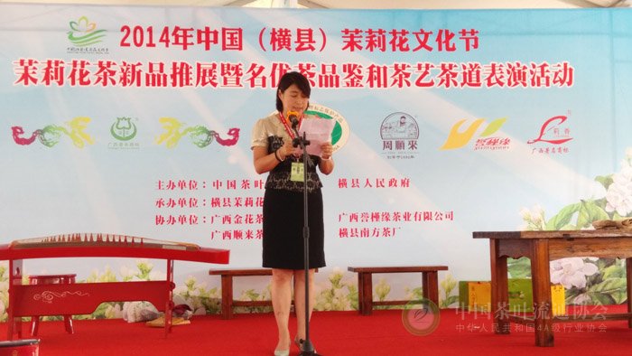 8月23日上午,在本次文化节开幕式结束后,在横县国际商贸城举行了由中国茶叶流通协会和横县人民政府主办的茉莉花茶新品推展暨名优茶品鉴和茶艺茶道表演活动。横县副县长覃志坚、中国茶叶流通协会常务副秘书长姚静波分别致辞。