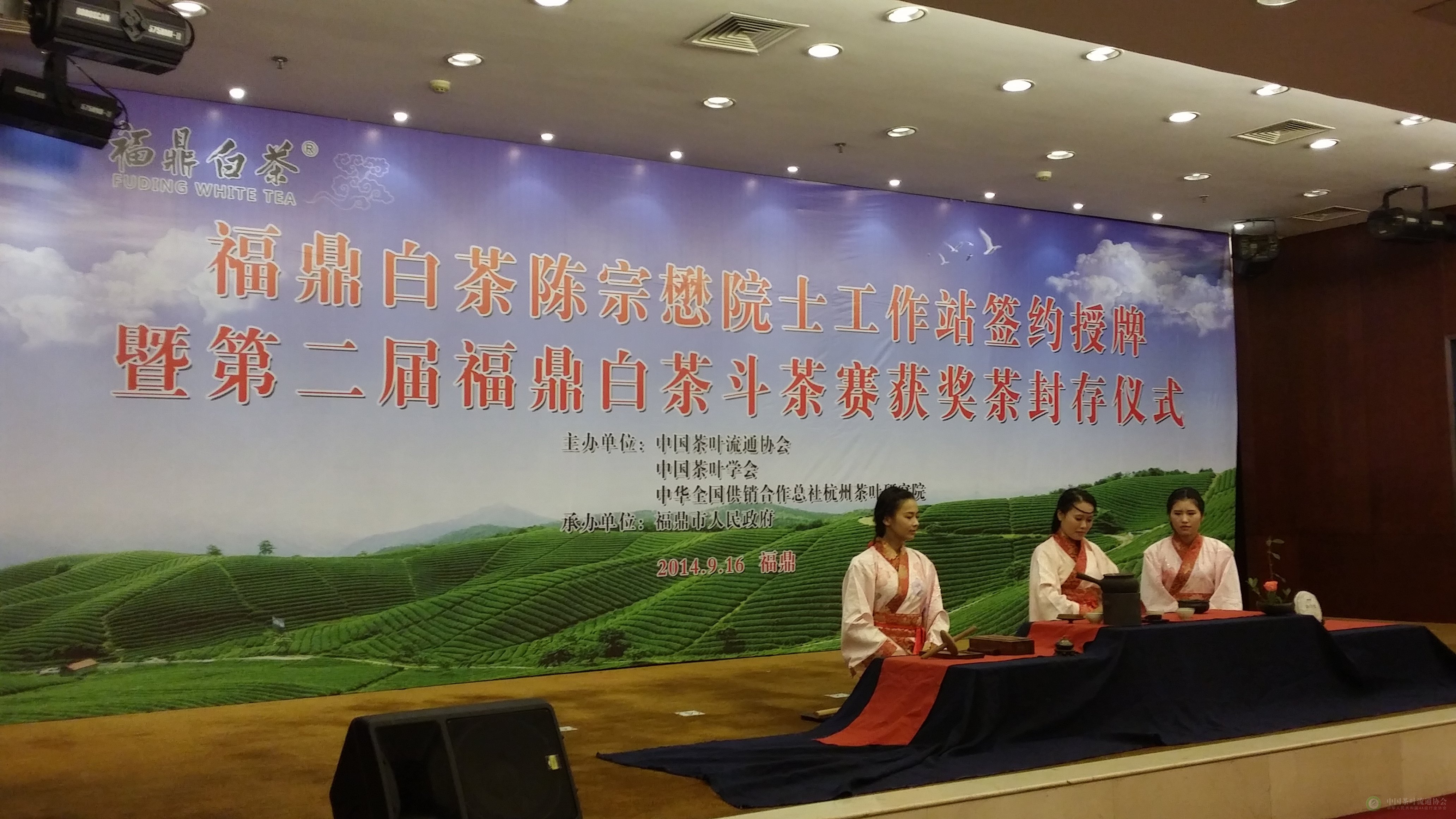 2014年9月16日上午,由中国茶叶流通协会、中国茶叶学会、中华全国供销合作总社杭州茶叶研究院主办,福鼎市人民政府承办的福鼎白茶陈宗懋院士工作站签约授牌暨第二届福鼎白茶斗茶赛获奖茶封存仪式在福鼎市举行。