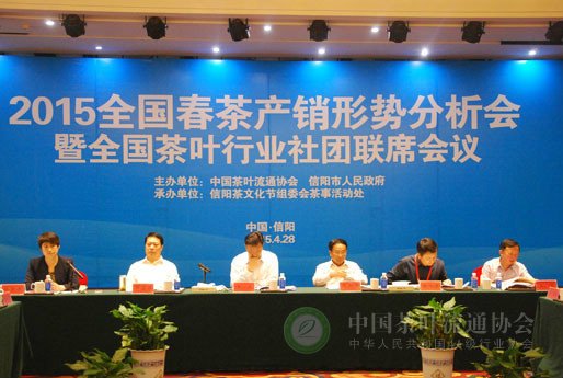 4月28日,“2015全国春茶产销形势分析会暨全国茶叶行业社团联席会议”在河南信阳召开,来自全国18个省市的50余位茶叶行业组织代表出席本次会议。会议积极热烈,与会代表交流各社团组织工作经验,分析研判新形势下全国2015年春茶产销形势,指导产业结构调整,引导适应消费新需求,为全国茶叶行业工作提出指导性意见。中茶协王庆会长出席本次会议并做会议总结。