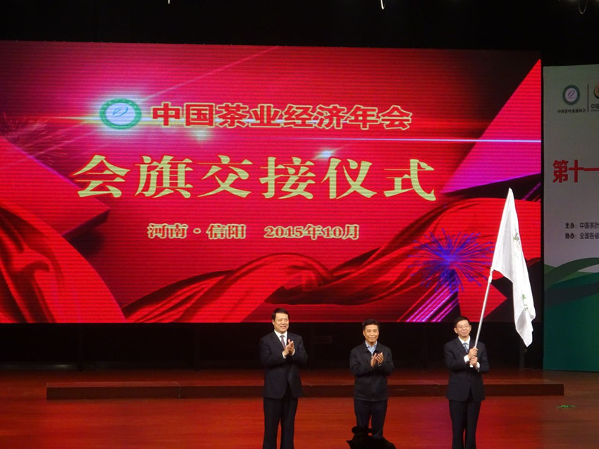 最后,伴随着振奋激昂的音乐,在中华全国供销合作总社副主任肖仲凯的主持下,中国茶业经济年会举行了隆重的会旗交接仪式:信阳市将中国茶业经济年会会旗交还中国茶叶流通协会,并由中国茶叶流通协会转交给下届年会承办单位——安徽省黄山市人民政府。年会的交接,意味着使命、希望、责任的传承,使人中国茶产业的美好未来充满期待与信心!