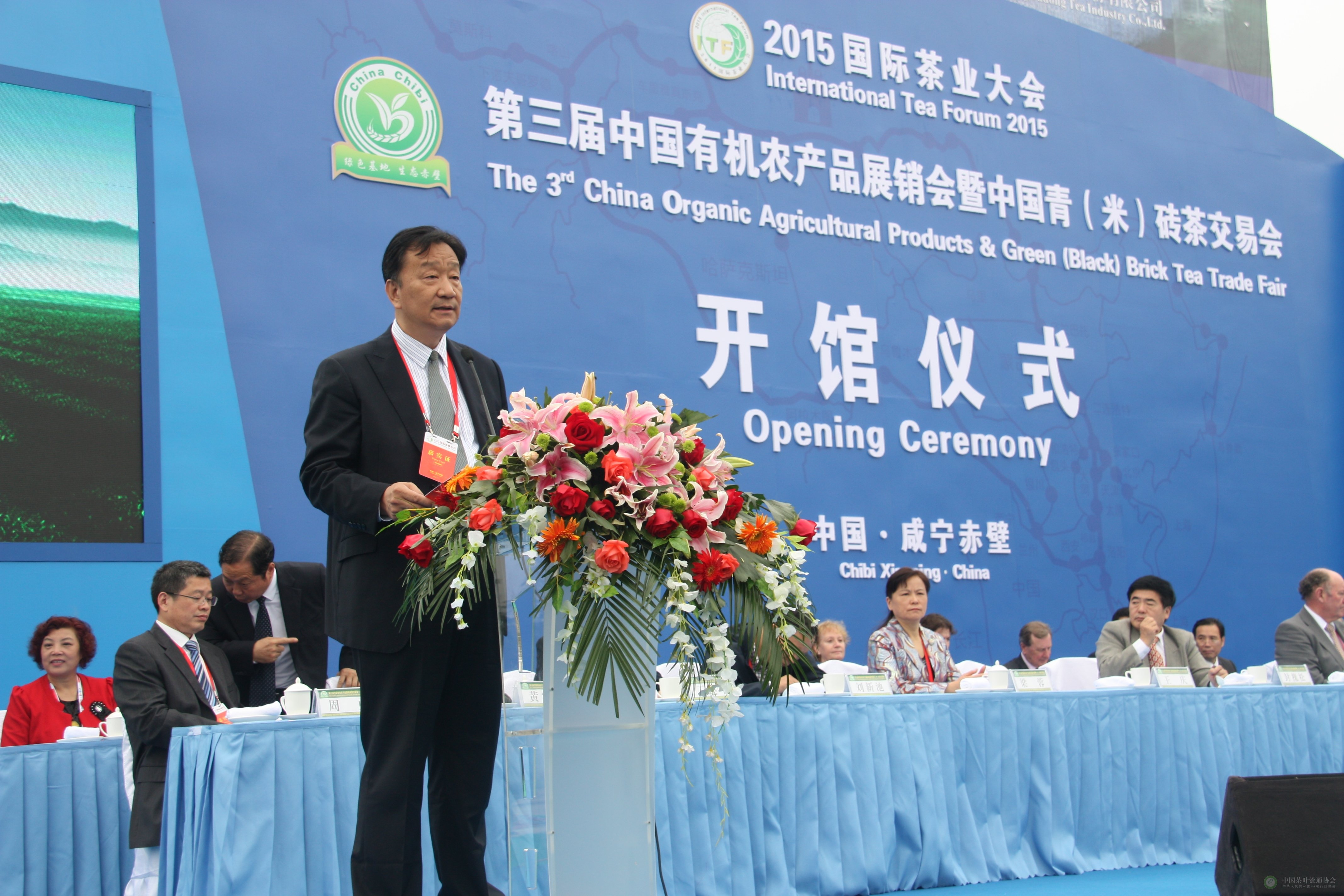 11月6日,由中国茶叶流通协会主办的第三届中国有机农产品展销会暨中国青(米)砖茶交易会开馆仪式在咸宁赤壁会展中心举行。中国茶叶流通协会常务副会长王庆出席并发表讲话,湖北省政府副省长甘荣坤,国家农业部种植业管理司封槐松处长,咸宁市委副书记陈树林以及联合国粮农组织政府间茶叶小组秘书长KaisonChang、国际茶业委员会主席NormanKelly等国内外相关行业专家,来自全国各地的行业组织代表、茶叶企业代表、业界专家学者、茶叶采购商、新闻媒体等共约800人出席了开馆仪式。