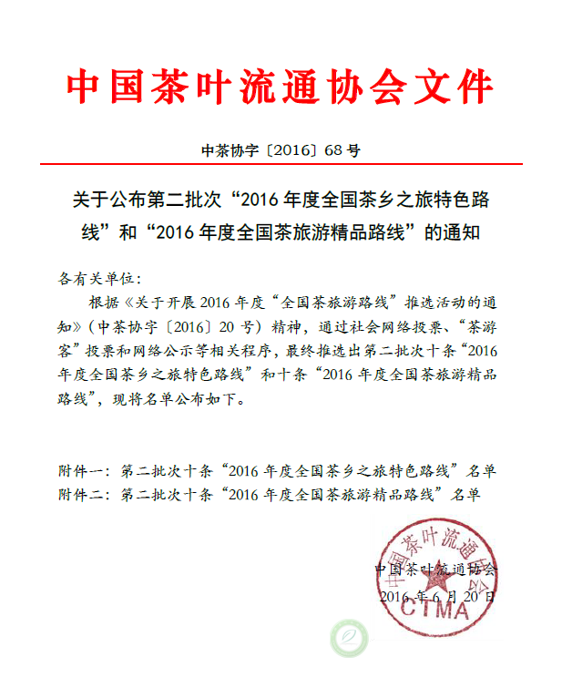 关于公布第二批次“2016年度全国茶乡之旅特色路线”和“2016年度全国茶旅游精品路线”的通知