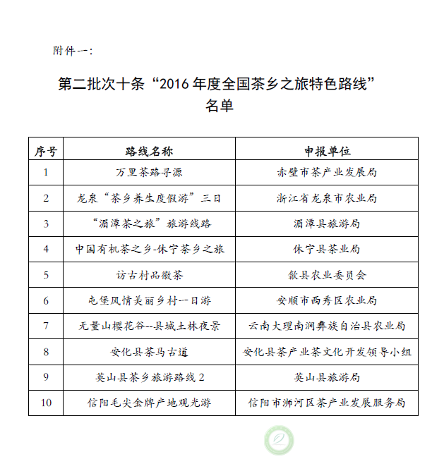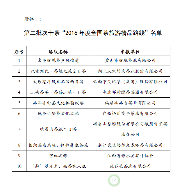 关于公示第二批次“2016年度全国茶乡之旅特色路线”和“2016年度全国茶旅游精品路线”候选名
