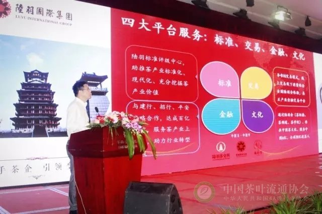 陆羽国际集团董事长严建红发表了《携手茶企、引领变革----建设新型市场经济茶商平台》的演讲。严建红先生介绍:陆羽国际集团源自茶圣故里湖北天门,是国内历史悠久、行业领先的茶文化集团,业务覆盖全国核心城市和主要产茶区。集团业务包括茶文化板块“陆羽会”(含茶经楼、茶频道、茶学院),金融板块“陆羽金服”(含茶交所、茶基金、文化金融),是国务院参事室国茶基金会执行单位、文化部特色文化企业、农业国际合作协会农业标准化、产业化、国际化示范单位,打造国际一流的茶文化产业及文化金融集团。集团在天门兴建了中国茶文化和茶标准的坐标——陆羽茶经楼,在武汉成立了中国首个省级茶交易平台——陆羽茶交中心、在深圳发行了中国首支茶基金——陆羽基金、在上海建立起首个茶文化金融推广团队——陆羽金服。今年陆羽国际集团的文化主题是:信任,从一杯茶开始。陆羽国际集团愿与中国6亿茶人共同见证和参与中国茶文化创新、复兴之路。