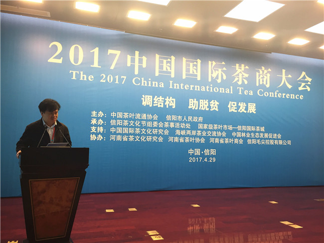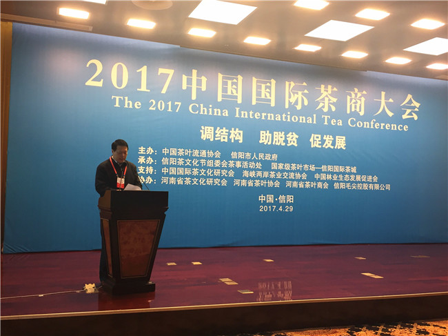 4月29日上午,由中国茶叶流通协会和信阳市人民政府主办的中国国际茶商大会在信阳百花之声国际会议厅隆重召开。大会以“调结构、助脱贫、促发展”为主题,旨在聚茶界之智,议发展之举,探讨如何顺应新形势新要求新常态,深入推进茶产业供给侧结构性改革,转型升级,提质增效,拓展业态,拉长链条,创新驱动,引领发展,助力茶区脱贫攻坚,促进茶产业可持续发展。