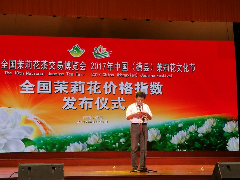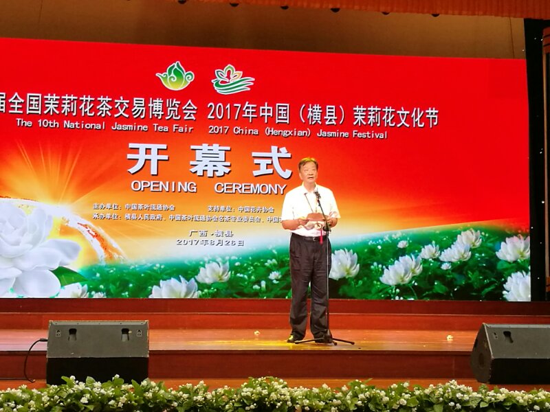 8月26日上午,第十届全国茉莉花茶博览会、2017年中国(横县)茉莉花文化节开幕式在横县国泰综合楼1号楼隆重举行。广西壮族自治区原副主席雷宇,中国茶叶流通协会常务副会长王庆,中共南宁市委常委、副市长张卫等领导嘉宾及来自国内外的政府企业代表约600人参加了本次开幕式。中共横县县委书记唐小若、中国茶叶流通协会常务副会长王庆先后致辞。随后,发布了全国茉莉花茶交易博览会、中国(横县)茉莉花文化节吉祥物“茉茉”和“莉莉”。之后,中茶协副秘书长梅宇公布了2017年全国茉莉花和茉莉花茶的价格指数。中茶协常务副秘书长姚静波宣布2017年全国茉莉花制作大赛、2017年全国茉莉花茶质量评比获奖名单。雷宇主席、王庆常务副会长等嘉宾领导为获奖者颁奖。最后,中共南宁市委 常委、副市长张卫宣布第十届全国茉莉花茶博览会、2017年中国(横县)茉莉花文化节开幕。