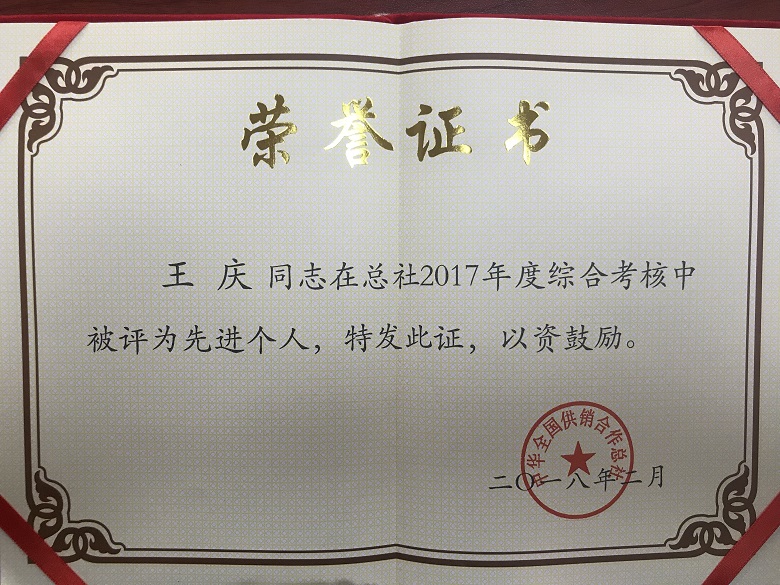 今日上午,总社2017年度总结表彰大会隆重举行。以中华全国供销合作总社党组书记、理事会主任王侠同志为首的总社领导班子全体成员出席会议。总社党组成员、理事会副主任杨汭主持会议。会上,我会荣获“2017年度综合考核先进集体”称号,王庆会长荣获“先进个人”称号。