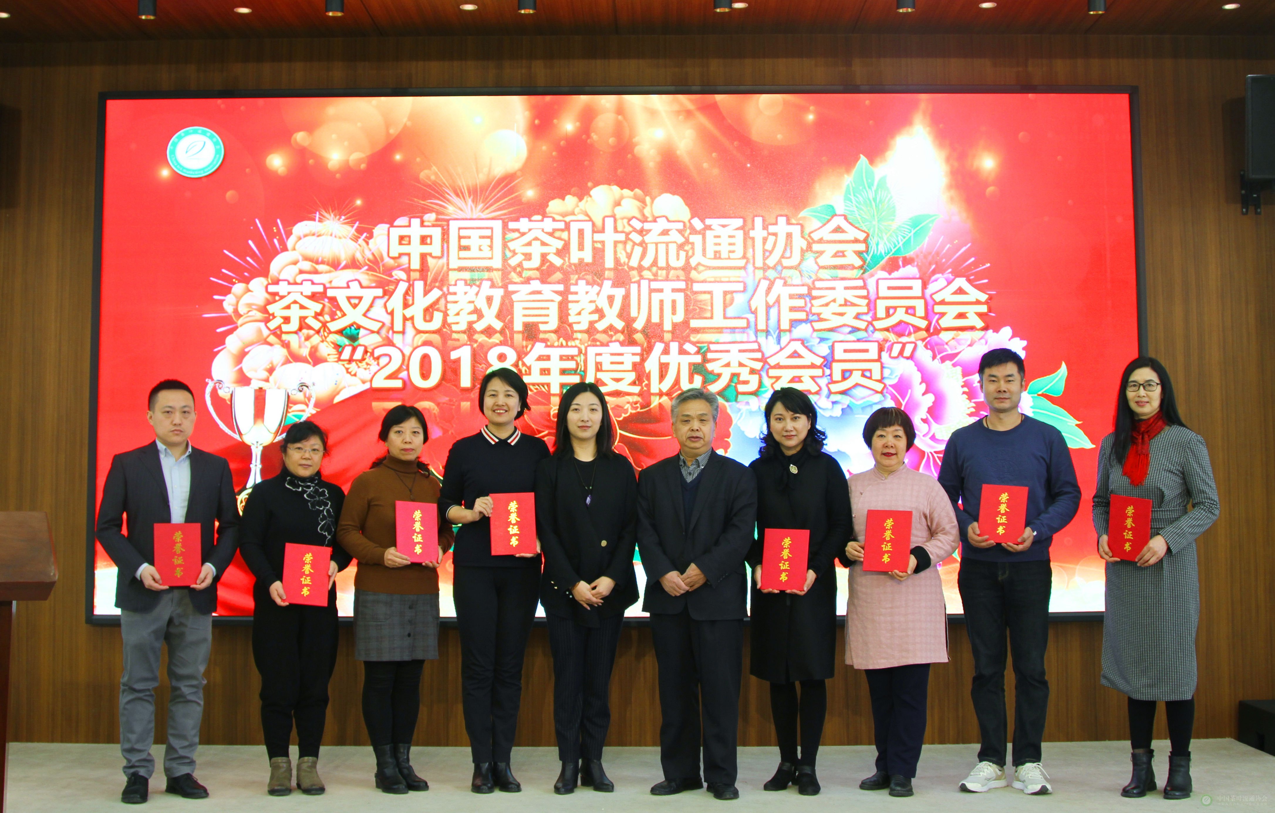 中国茶叶流通协会副秘书长肖星和中茶协茶文教教育教师工委会副主任薛德全为工委会“2018年度优秀委员”颁发证书