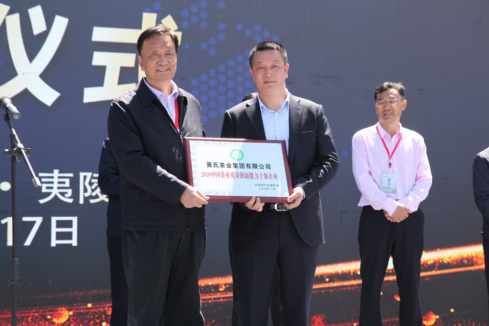 投产仪式上,王庆会长发表贺词,并向萧氏茶业集团颁发了“2018中国茶业质量创新能力十强企业”牌匾。贺词中,王会长在向20年来植根“三农”、耕耘茶业、锲而不舍的萧氏茶人表示热烈祝贺的同时,指出:“无人工厂”的竣工投产,是萧氏茶叶集团创新实践的一个行业贡献,是中国现代茶业史上的重大突破,提高了茶业供给体系质量和效率,吹响了茶叶传统产业向清洁化、工业化、现代化和智能化转型跨越的新时代号角。