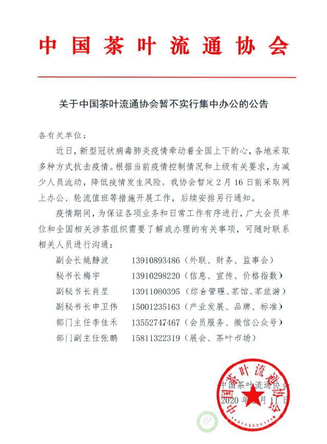 关于中国茶叶流通协会暂不实行集中办公的公告