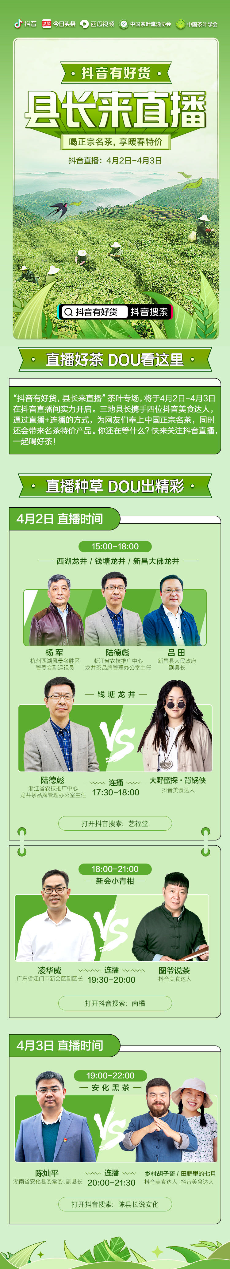 从4月2日至5月初,“县长来直播”春茶专场系列活动计划将陆续组织包括浙江西湖龙井、江苏洞庭碧螺春、安徽黄山毛峰、河南信阳毛尖等中国传统十大名茶在内的全国近20个代表性名茶产区县长走进抖音直播间,向网友们介绍当地茶叶,在分享茶香的同时,提升产品认知度和品牌影响力,带动茶农们增收。