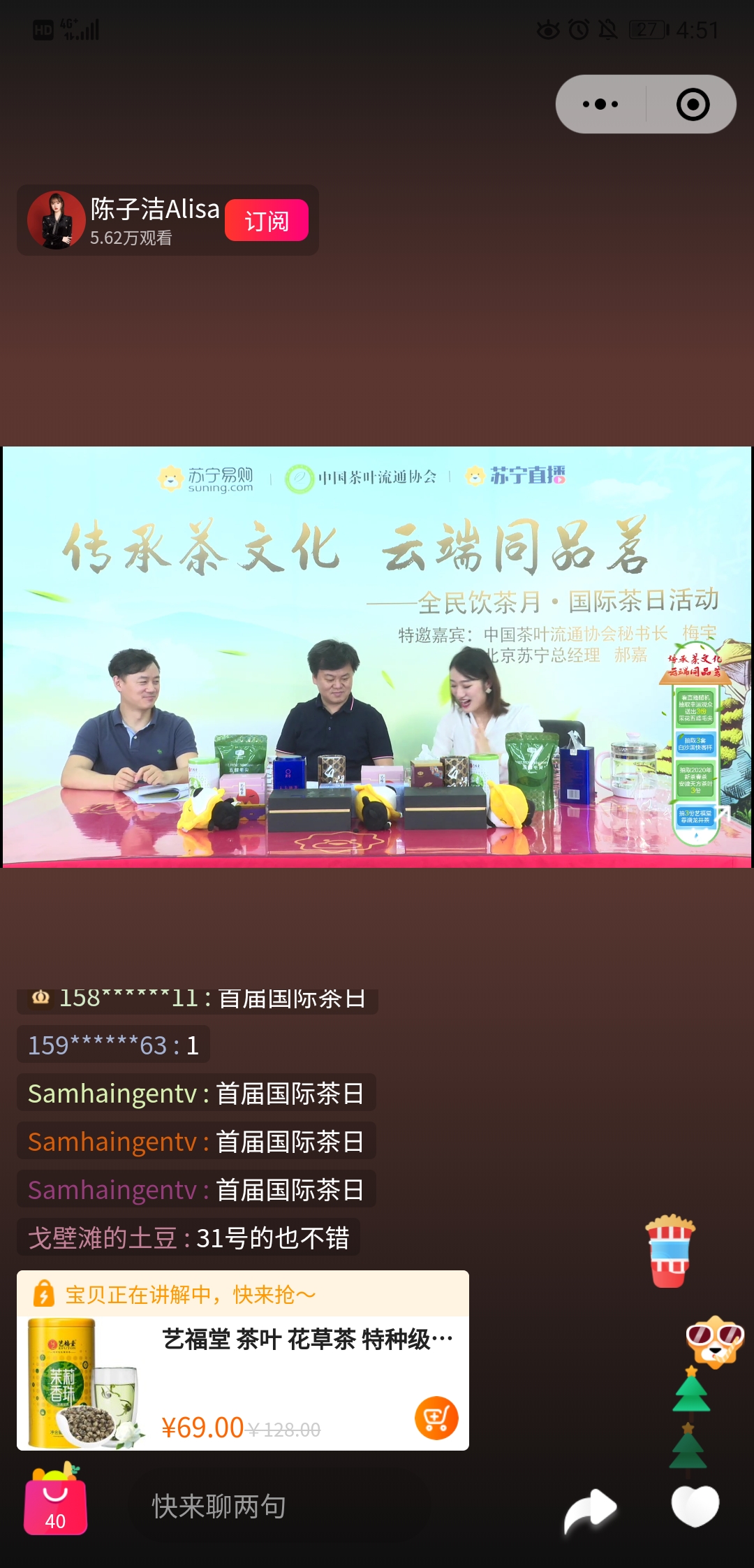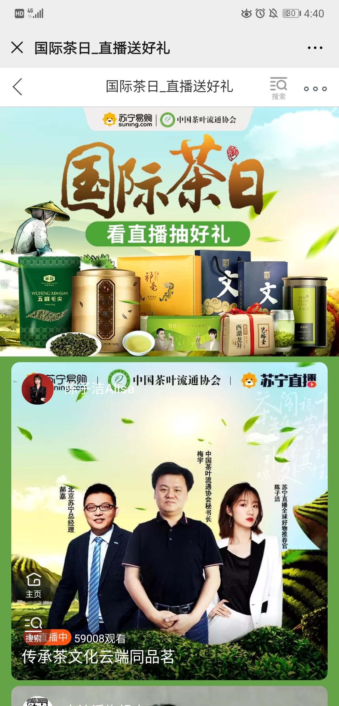 本次为期两天的系列活动是中茶协与苏宁自3月初签署战略合作协议以来的直播首秀。利用“国际茶日”这一契机,按照“中国茶叶营销年”工作方案,发挥苏宁在线上线下领域的优势,采取企业单场品牌推荐与主办方联合专场推荐接力直播的方式,中国茶叶流通协会推荐艺福堂、白沙溪、采花、天方四家品牌企业,参与了5月20日和21日的“全民饮茶月·苏宁521品牌推荐活动”。