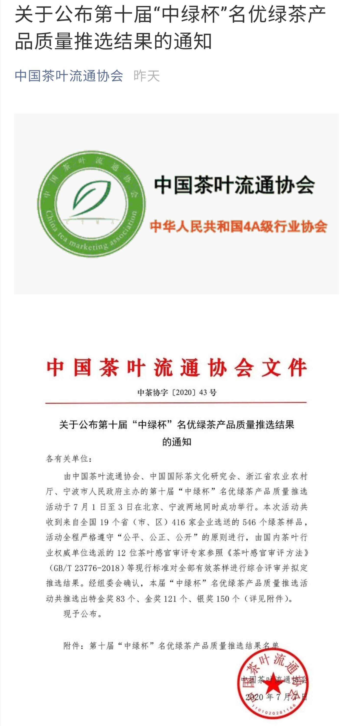 7月7日晚,第十届“中绿杯”名优绿茶质量推选结果通过中国茶叶流通协会官方微信平台正式对外发布,共有354款茶样榜上有名,具体包括特金奖83个、金奖121个、银奖150个,截至发稿时止,推选结果浏览量已突破1.2万人次,这也为本次推选活动划上了圆满句号!
