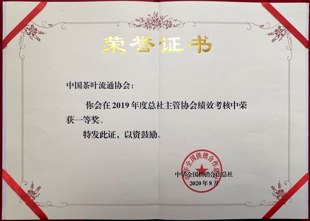 经考核,中国茶叶流通协会荣获中华全国供销合作总社主管协会2019年度绩效考核一等奖。