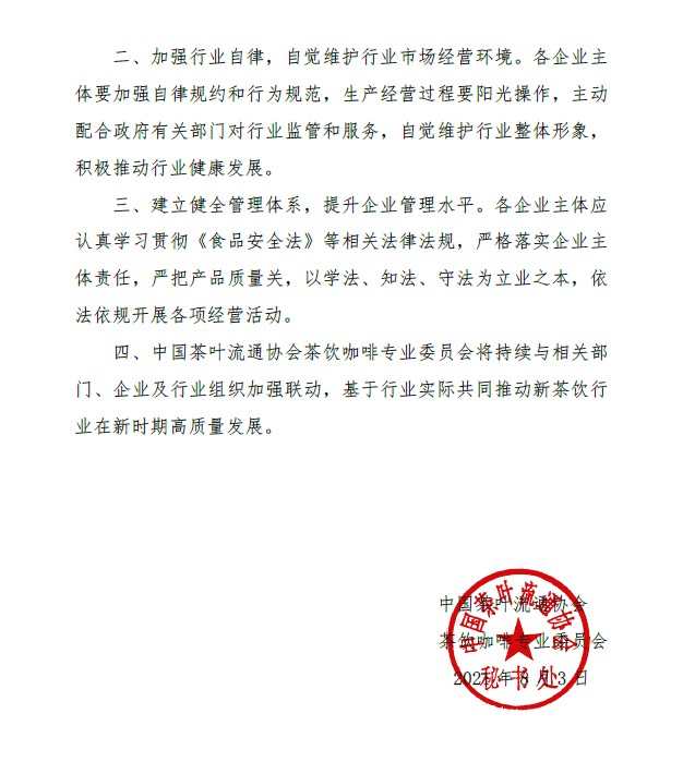 关于“提升食品安全主体责任意识,加强新茶饮行业自律”的倡议