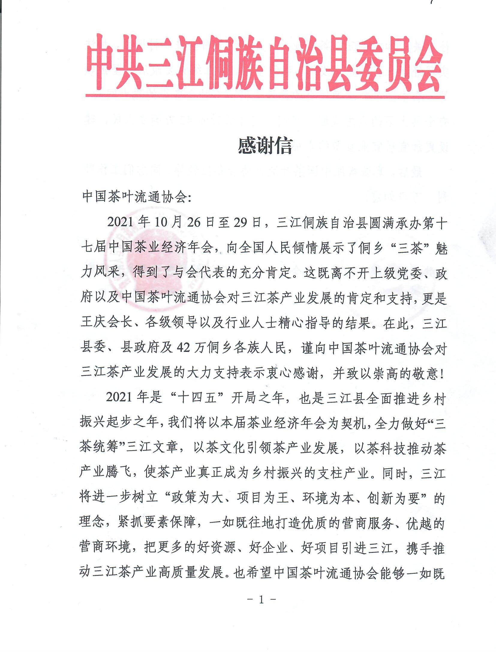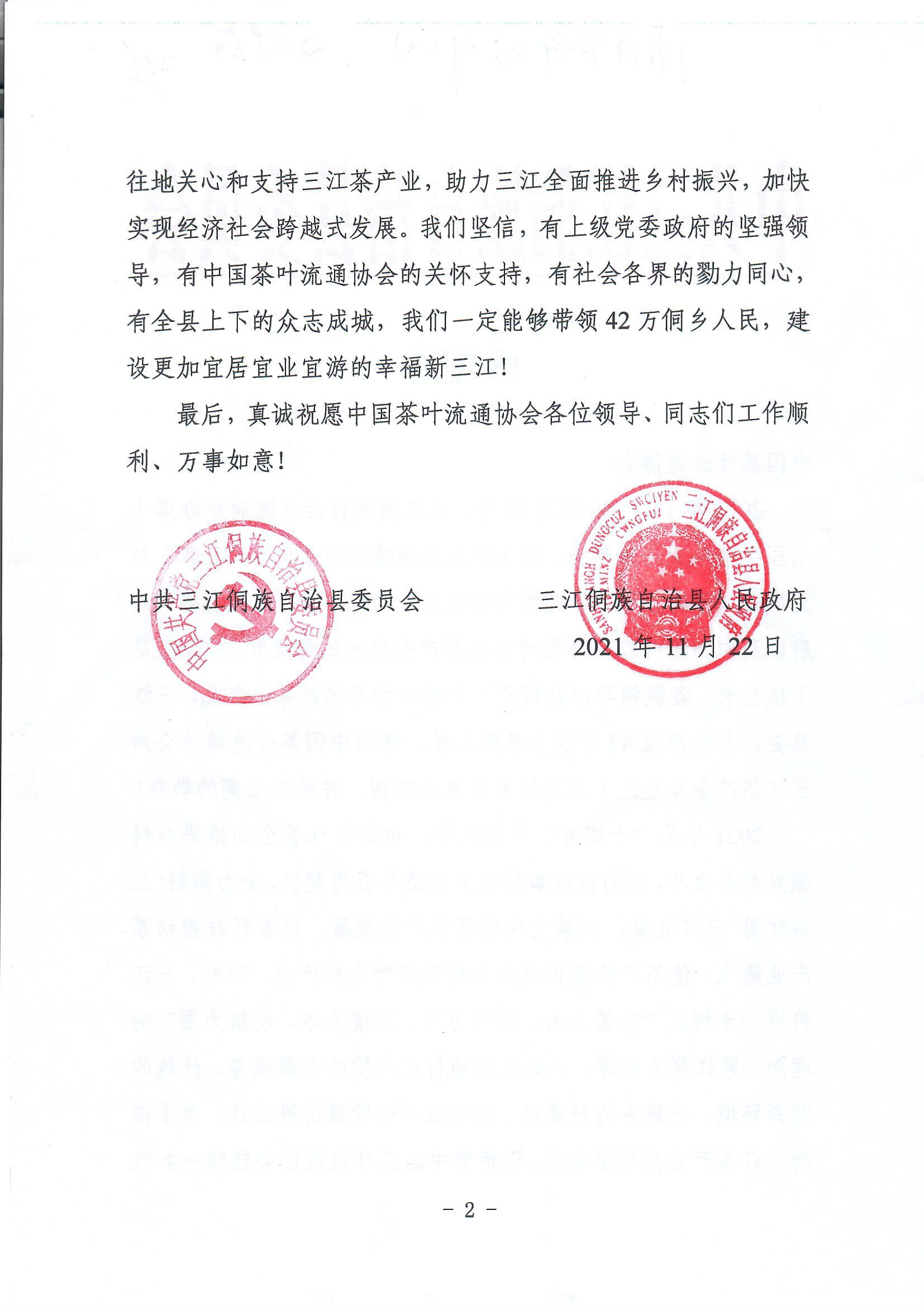 近日,中共三江侗族自治县县委、县政府专程致信,对我会在三江圆满成功主办第十七届中国茶业经济年会及对三江茶产业发展的支持致以衷心感谢,并表示将与我会继续紧密携手,共同推进三江乡村振兴建设,加快实现经济社会跨越式发展。