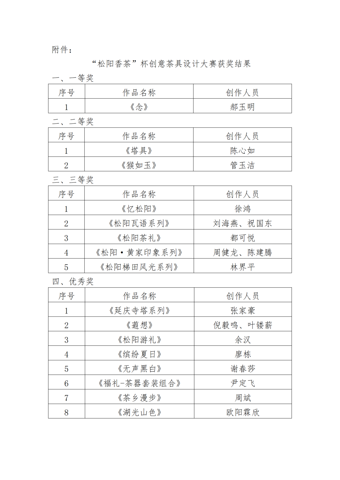 关于公布“松阳香茶”杯创意茶具设计大赛结果的通知