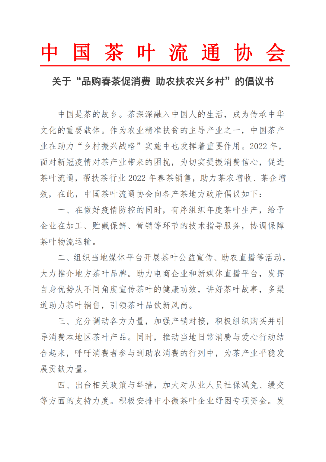关于“品购春茶促消费 助农扶农兴乡村”的倡议书