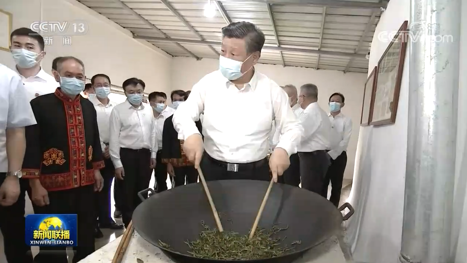 海南五指山2022年4月11日,习近平总书记来到五指山市水满乡毛纳村调研,沿村道边走边看。黎族村民王柏和一家热情将总书记迎进家里。习近平总书记察看院落、客厅、卧室等,在手工茶坊参与炒茶劳动,并买下两袋茶叶。习近平总书记勉励他们把茶叶经营好,把日子过得更红火。