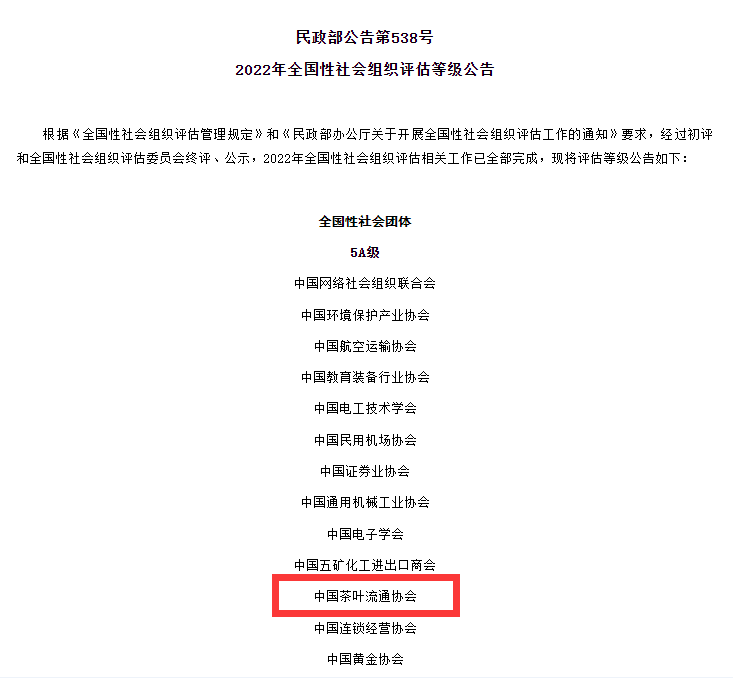 2022年11月28日,民政部发布《2022年全国性社会组织评估等级公告》,中国茶叶流通协会获评为5A级全国性社会团体,成为2022年全国13个5A级协会之一。