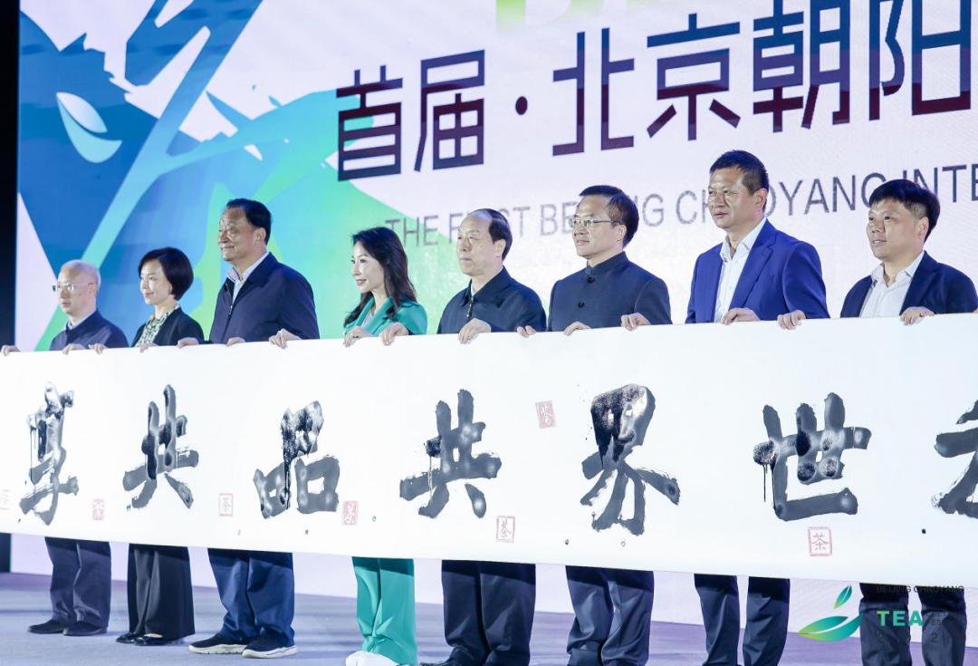 最后,与会领导共同上台,手持不同版本的“茶”字印章,为书法作品刻印,庆祝首届“北京朝阳茶香文化节”成功举办。