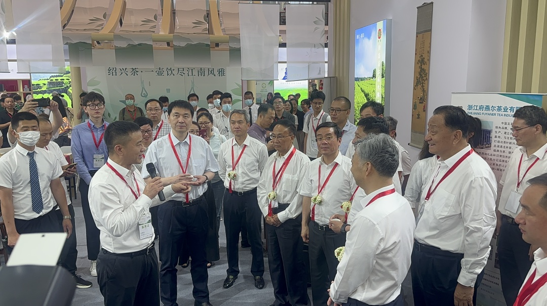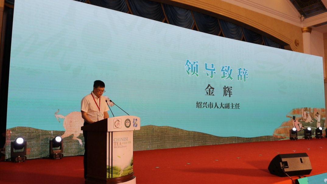 绍兴市人大副主任金辉上台致辞,表示新昌通过持续做大茶产业、做强茶科技、做深茶文化、做优茶品牌,成功打造了“大佛龙井”、“天姥红”、“天姥云雾”精品茶。并通过茶产业数字化转型升级,推动建成了省级数字化茶企1家、数字茶园3个、数字化生产线11条,为茶产业的高质量发展提供了典型示范。