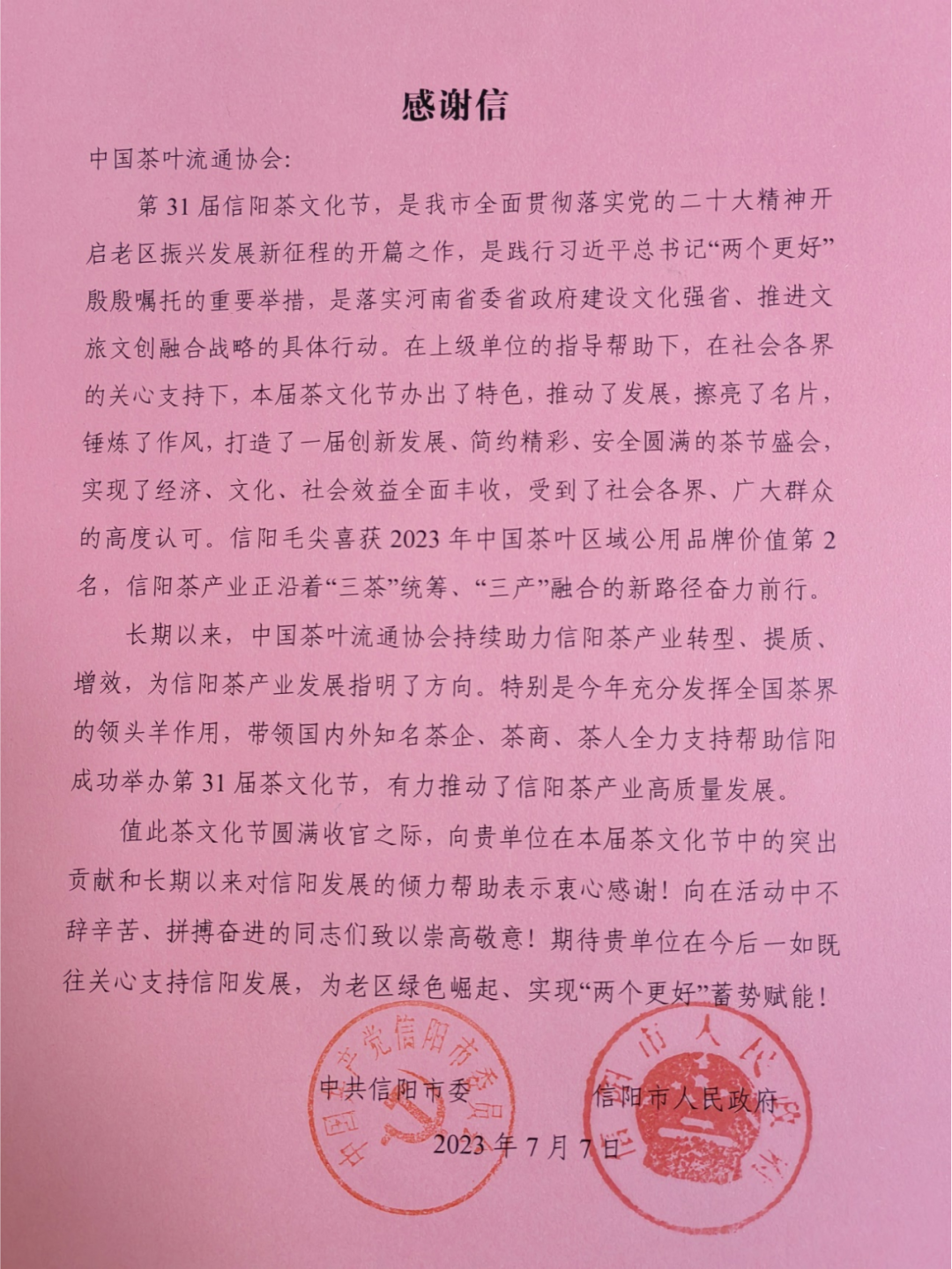 近日,中共信阳市委、市人民政府专程发来感谢信,对我会在第31届信阳茶文化节中所做的工作和长期以来对信阳茶产业发展的倾力帮助致以衷心感谢,并期待我会持续关心支持信阳茶产业发展,为老区绿色崛起、实现“两个更好”蓄势赋能。