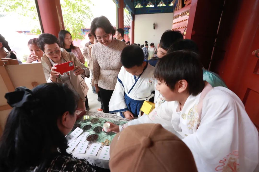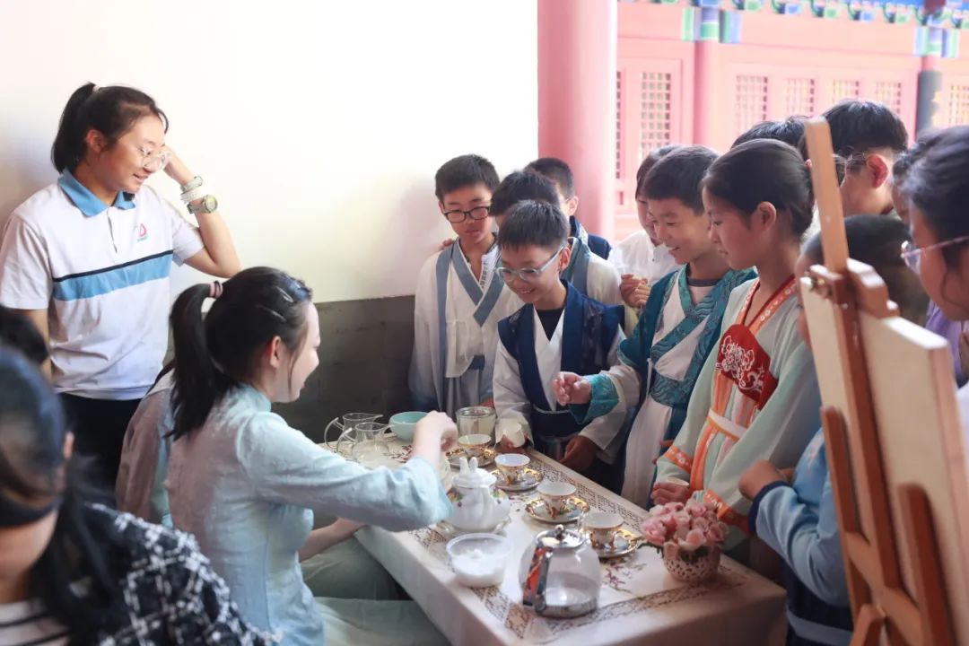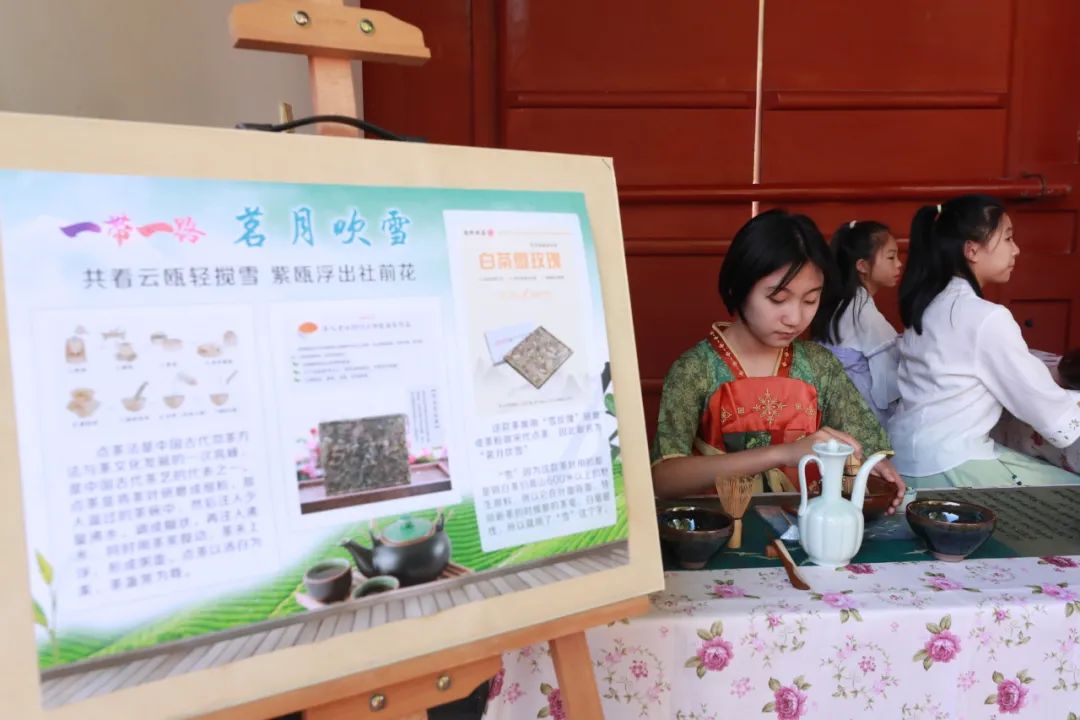 同学们分别走近各自“一带一路”主题茶席并开展交流分享。小伙伴们共同品鉴红茶鼻祖正山小种,在交流中学习红茶在世界各地的传播;在“茉莉花茶”茶席,香气馥郁的茶香使人陶醉,同学们鉴赏各品类的花茶,还特别兴奋地与茉莉花茶国家级非遗传承人孙丹威老师进行互动交流;在“六堡茶”主题茶席,同学们品尝到了广大侨胞喜爱的六堡茶,并了解到这款茶传播海外的故事。其中,人气较高的茶席是宋代点茶的互动区域,同学们在小茶人的带领下点出一碗沫饽丰厚的茶,体会劳动与创造的喜悦,感受宋代点茶文化的魅力。