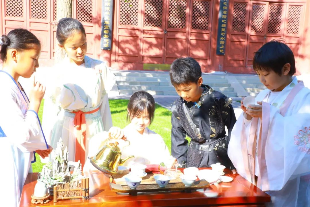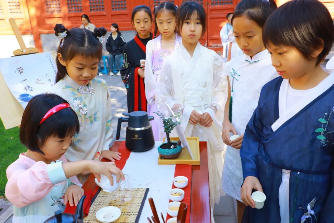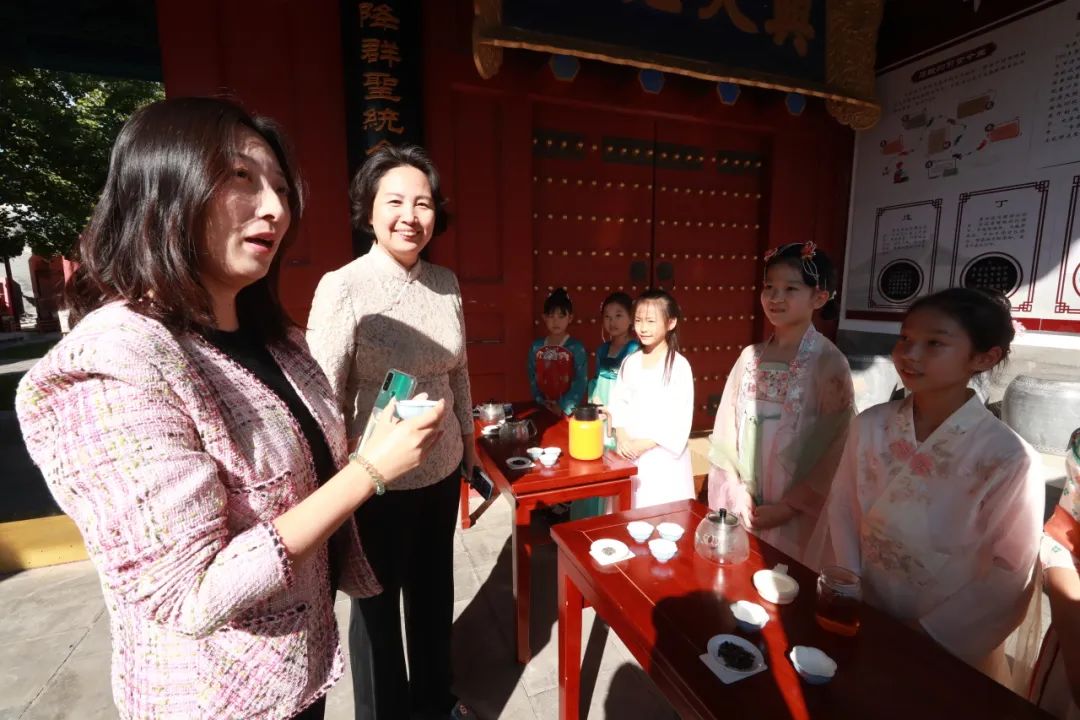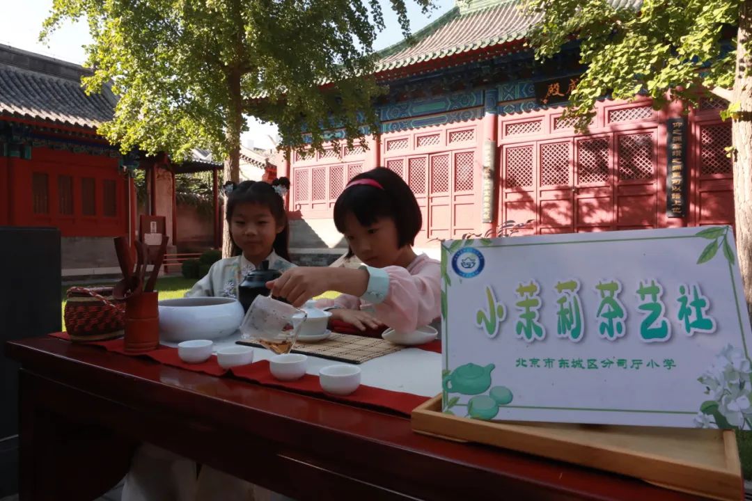 随后,在府学胡同小学民乐团古筝学生演奏的《渔舟唱晚》音乐伴奏下,新鲜小学、分司厅小学和东直门中学的同学们共同冲泡香茗,并邀请现场嘉宾和伙伴们共品香茗。
