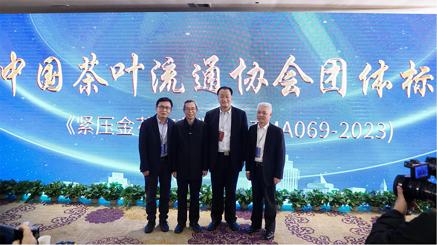 会上,中国茶叶流通协会会长、全国茶叶标准化技术委员会主任委员王庆与湖南农业大学茶学系教授、博士生导师肖力争,常德市茶叶产业办公室常务副主任贺立新,常德市茶业协会会长、湖南武陵红茶业有限公司董事长黎军等相关标准起草单位代表共同上台发布了中国茶叶流通协会团体标准《紧压金花红茶》(T/CTMA 069-2023)。发布仪式后,肖力争教授对《紧压金花红茶》标准及其产品对行业的意义、工艺技术创新、产品特色、功效等方面做了全面的介绍和分享。