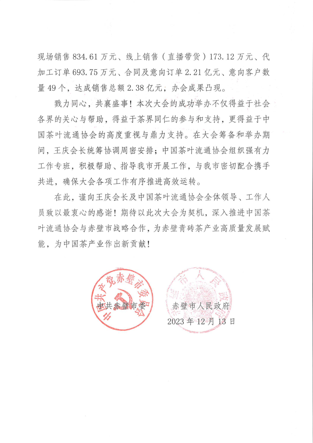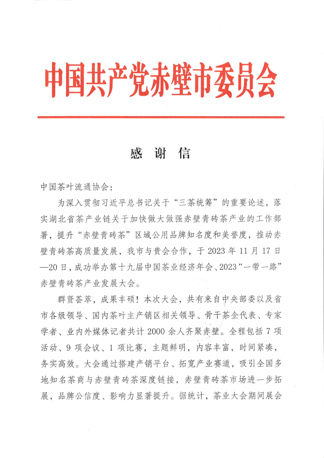 近日,中共赤壁市委、市人民政府专程发来感谢信,对我会在赤壁成功举办第十九届中国茶业经济年会致以衷心感谢,并表示将以此次大会为契机,深入推进与协会的战略合作,为赤壁青砖茶产业高质量发展赋能,为中国茶产业作出新贡献!