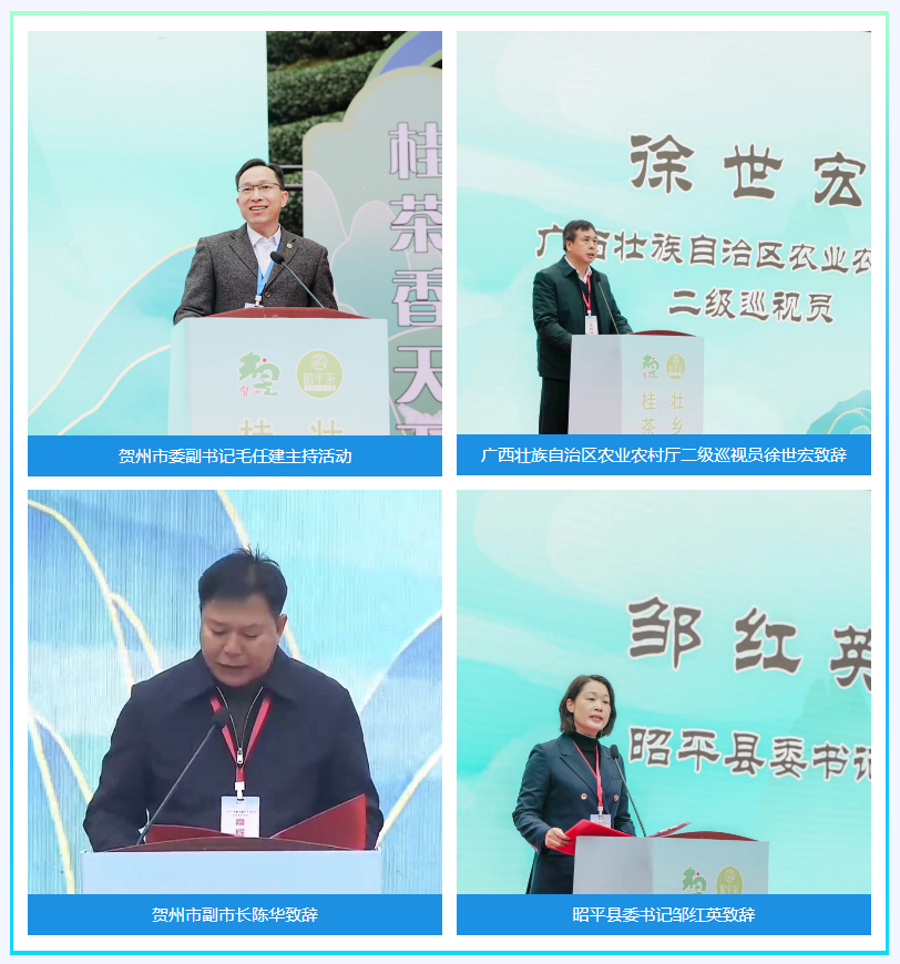 贺州市委书记李杰云出席活动并宣布活动开幕。出席本次活动的领导嘉宾还有:广西壮族自治区农业农村厅二级巡视员徐世宏,贺州市委副书记毛任建,贺州市委常委、副市长谢兵,贺州市副市长陈华,贺州市副市长杨瑞芳,贺州市政协副主席覃汝胜,中国茶叶流通协会副会长姚静波,昭平县委书记邹红英,昭平县委副书记、县长邓忠耀等相关领导和嘉宾出席了启动仪式。