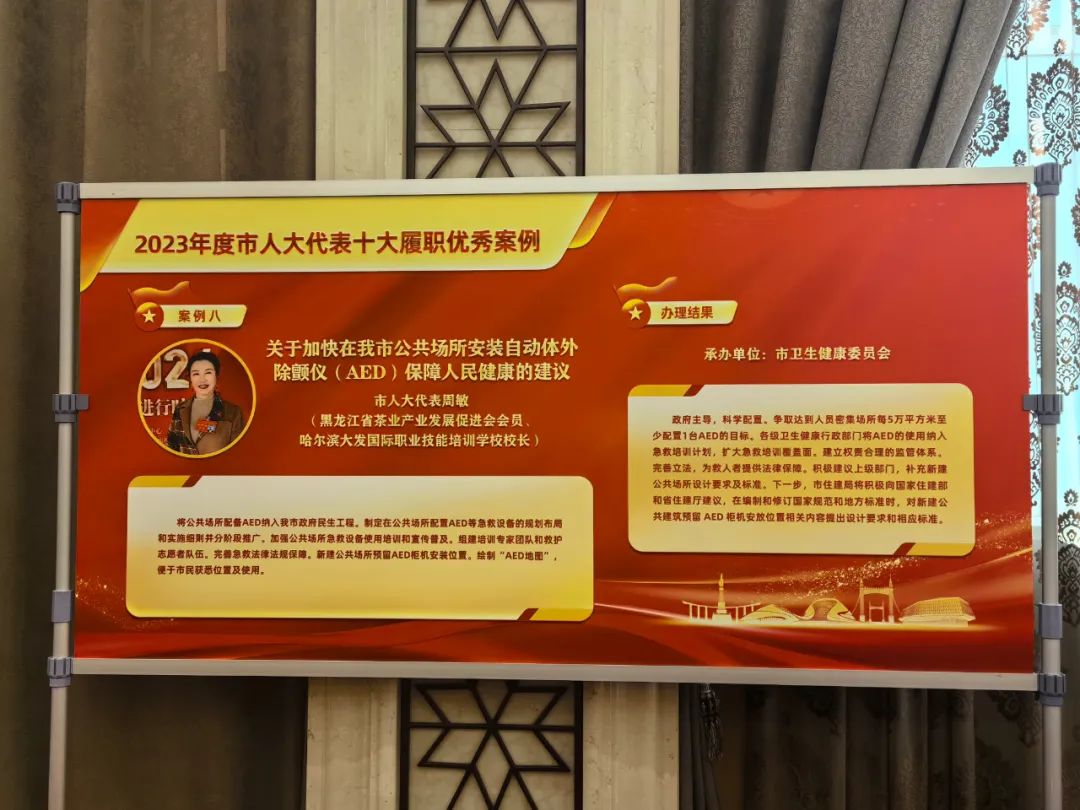 在2月5日举办的哈尔滨市第十六届人民代表大会第三次会议上,周敏代表提出了十二项有关民生、经济、食品安全、推动小微企业和个体工商户发展、营商环境等方面的建议,得到了与会领导及代表们的一致肯定,引起高度的共鸣和深度的思考、吸引力广大新闻媒体的广泛关注,并就立足自身建设助力哈尔滨打造“向北开放之都”取得的成绩和创新发展规划等方面,接受了专访,收获了广大网友及市民的点赞。其中《关于加快在我市公共场所安装自动体外除颤仪(AED)保障人民健康的建议》得到了市人大常委及有关部门的高度重视,并由市卫生健康委员会承办落实,及时确立了工作规划与培训计划,建立监管体系、完善立法、实施标准,为救人者提供法律保障,进一步推动了哈尔滨市公共安全的发展建设,为人民健康安全提供了强有力的保障。