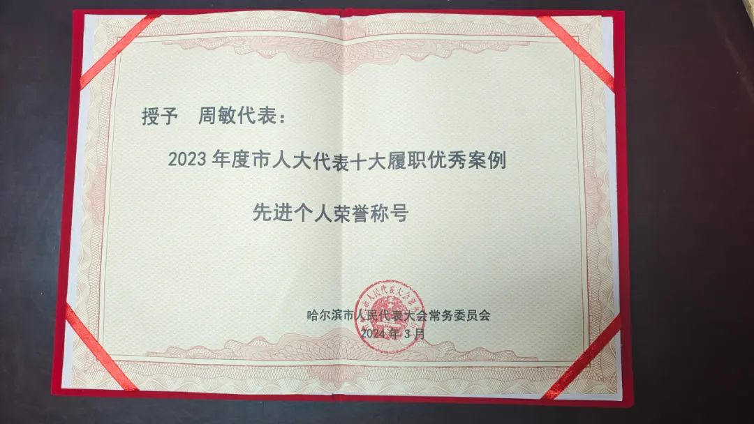 2024年3月12日,哈尔滨市人大常委召开了市十六届人大三次会议人大代表建议交办工作会议。中国茶叶流通协会副会长、黑龙江省茶业产业发展促进会会长、大发国际集团董事会主席、大发国际职业技能培训学校校长周敏,荣获“2023年度市人大代表十大履职案例先进个人荣誉称号”。