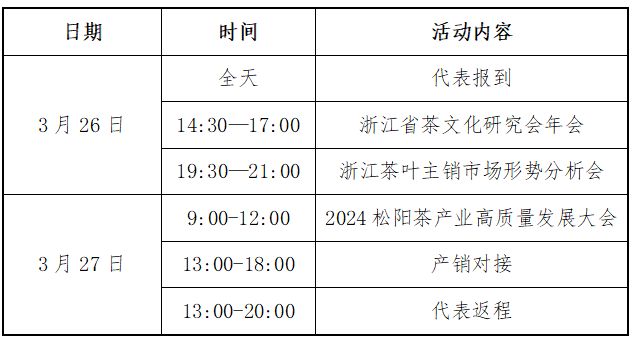 为进一步提升我国茶产业发展水平,坚持产业兴茶、质量兴茶、绿色兴茶,促进三产融合发展,推动区域茶产业高质量发展,松阳县人民政府将于2024年3月26日至27日,在浙江省松阳县举办“2024松阳茶产业高质量发展大会”。现将有关事项通知如下: