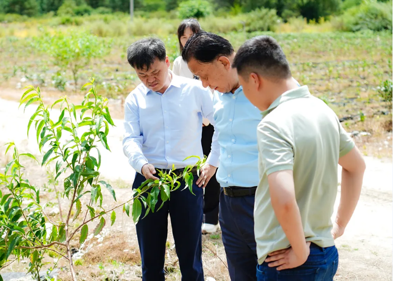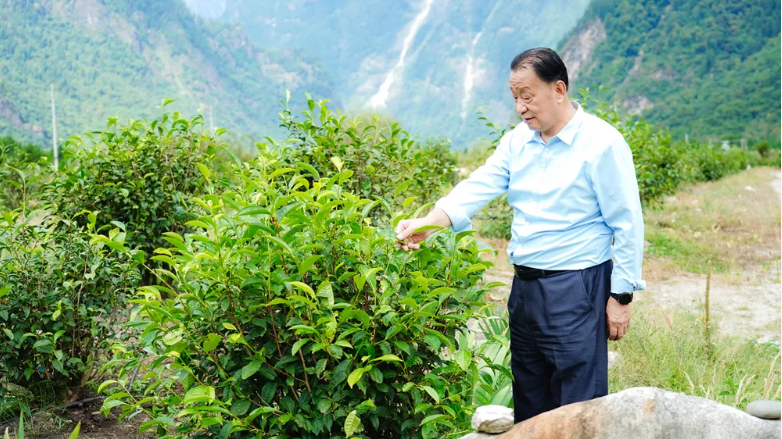 图4 王庆会长查看茶树长势(林芝圣维农业发展有限公司茶园)
