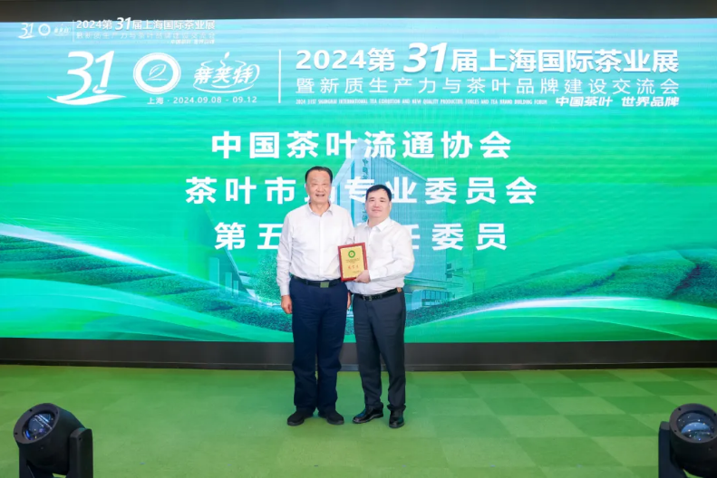 王庆会长在开幕式上为协会副会长、上海帝芙特投资集团有限公司董事长庞言良颁发“中国茶叶流通协会茶叶市场专业委员会第五届主任委员”证书。