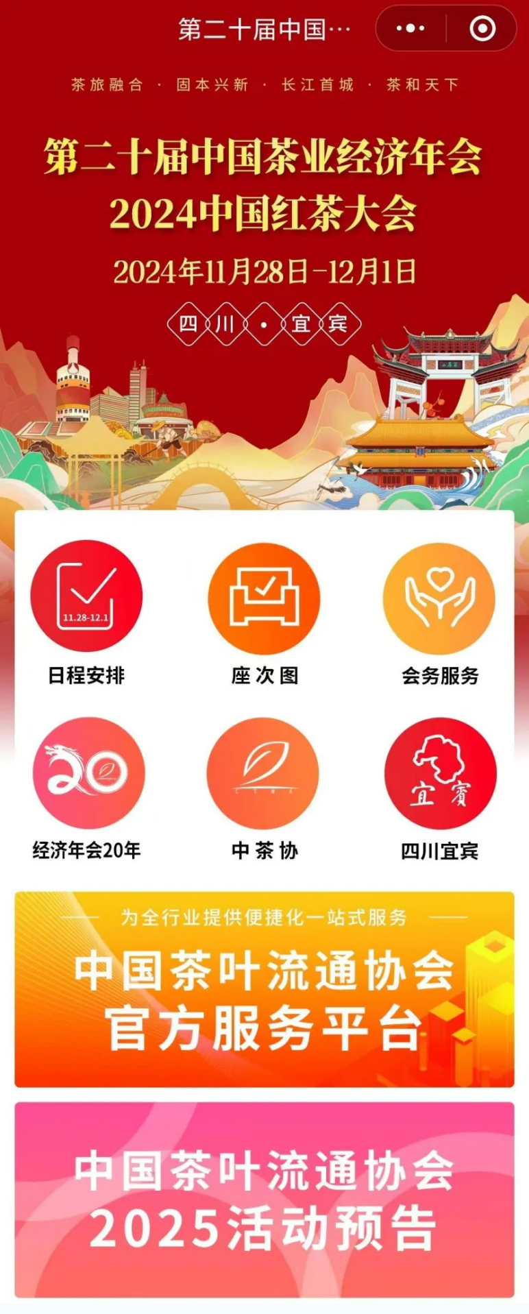 第二十届中国茶业经济年会专题板块正式在协会小程序上线运行,会员代表可登录中国茶叶流通协会官方小程序随时了解最新年会动态。