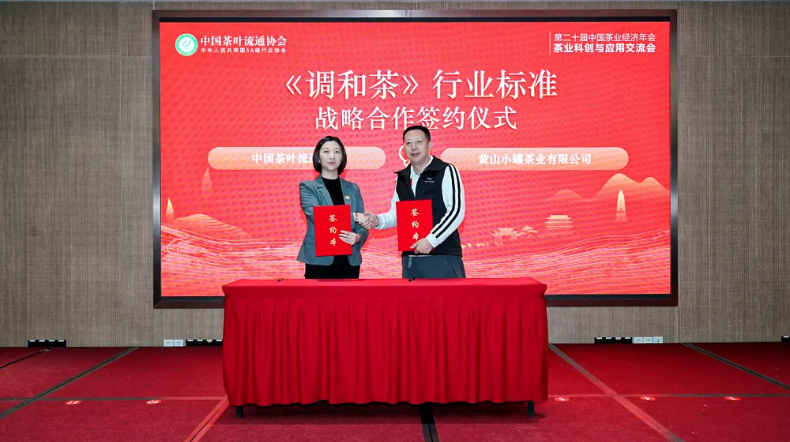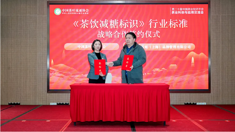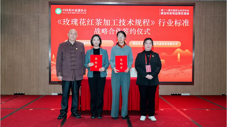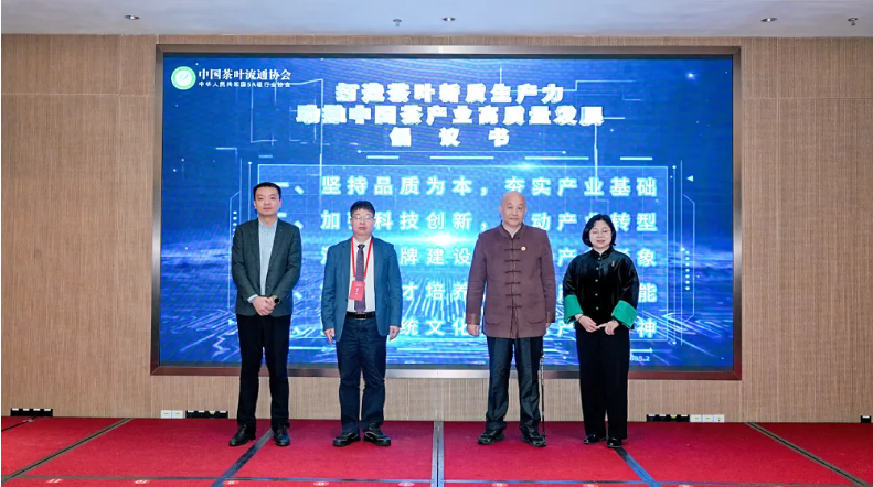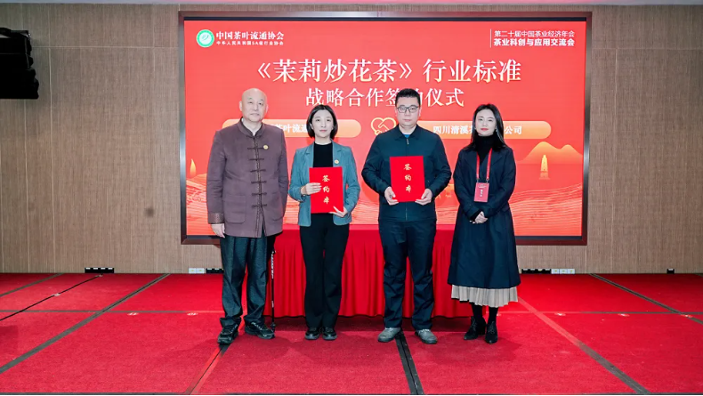会议上,中国茶叶流通协分别与《调和茶》《茶饮减糖标识》《茉莉炒花茶》《玫瑰花红茶加工技术规程》4项行业标准的主要起草单位举行了战略合作签约仪式。最后,中国茶叶流通协会、中经社(新华快看)、“三安”茶业发展联盟、宜宾市政府共同发布了“打造茶叶新质生产力助推中国茶产业高质量发展”倡议书。