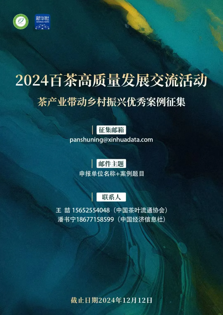 2024百茶高质量发展交流活动,定于2024年12月14日在福建省安溪县举办。作为此次活动的重要环节之一,新华社中国经济信息社联合中国茶叶流通协会等机构共同发起的“茶产业带动乡村振兴优秀案例征集活动”于12月5日起正式启动。此次征集旨在深入挖掘茶产业在推动乡村振兴与共同富裕进程中的丰硕成果,展示各茶产区在产业发展、品牌建设和文化传承等方面的优秀模式和宝贵经验。