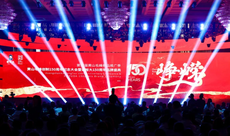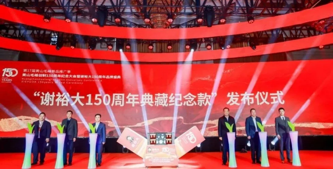 “谢裕大150周年纪念款”全球首发引发全场瞩目。该产品首次集齐黄山毛峰、太平猴魁、祁门红茶、六安瓜片四大徽茶珍品,以0.1%严苛选品率搭配国瓷永丰源定制的青花茶器,成为徽茶文化的典藏符号。
