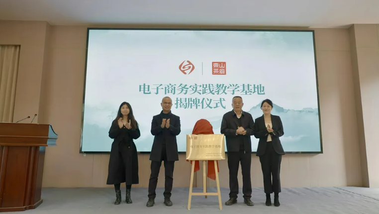 东山茶厂董事长柳荣伟,总经理柳倩楠等嘉宾为电子商务实践教学基地揭牌,该基地创新构建"产教双轨"模式,既为学生打造直播电商实战平台,又组建师生服务队深入茶产业链,通过采制茶实践赋能乡村振兴,助力打造"茶韵东山"文旅IP标杆。