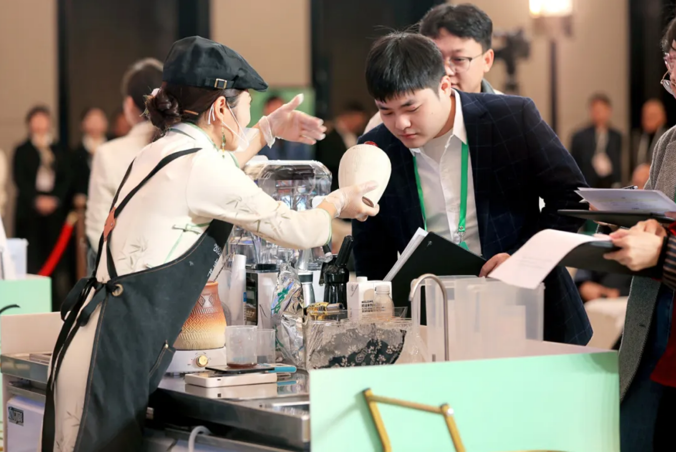 2024新茶饮大会现场,评审嘉宾同活动代表交流现制茶饮配方研发思路。