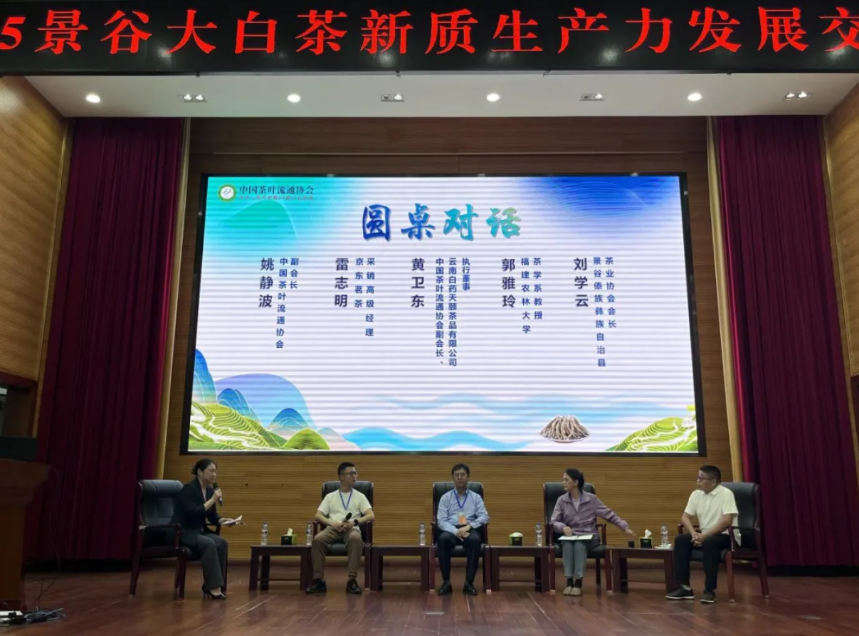 圆桌对话环节,在中国茶叶流通协会姚静波副会长的主持下,福建农林大学茶学系教授郭雅玲,中国茶叶流通协会副会长、云南白药天颐茶品有限公司执行董事黄卫东,京东茗茶采销高级经理雷志明,景谷县茶叶协会会长刘学云分别围绕工艺创新、科技赋能、品牌实践、渠道拓展等方面进行了深入的探讨,剖析了景谷大白茶产业发展优势与困点,为景谷茶产业发展提出了诸多建设性意见。