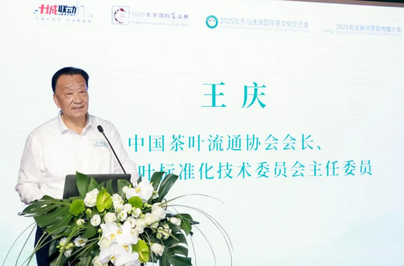 王庆会长在致辞中表示,中国茶文化源远流长,茶产业作为传统优势产业,正迎来品牌化、数字化、国际化的发展机遇。中国茶文化正以科技创新驱动转型升级,推动"茶产业+数字科技+金融"深度融合。希望大家以茶为媒,以茶会友,通力合作,携手推动马连道转型升级,助力中国茶在世界舞台绽放更璀璨的光芒。
