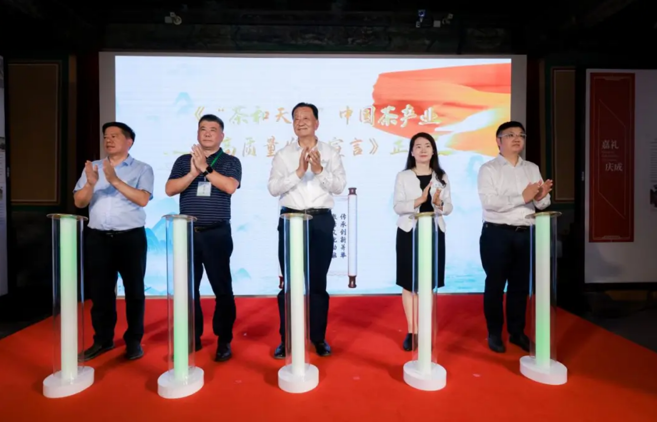 活动最后,中国茶叶流通协会会长、全国茶叶标准化技术委员会主任委员王庆,北京市西城区副区长郭洁,中国茶叶股份有限公司中国茶叶销售一体化筹备组组长、中茶厦门总经理赵大川,中茶协荣誉副会长、四川省茶叶集团股份有限公司董事长何锐,福建春伦集团有限公司总裁傅天甫共同发布《“茶和天下”中国茶产业马连道高质量发展宣言》,围绕传承创新并举,激活文化动能,开放协作共赢,践行绿色理念等方面,擘画未来蓝图,赋能茶产业升级。
