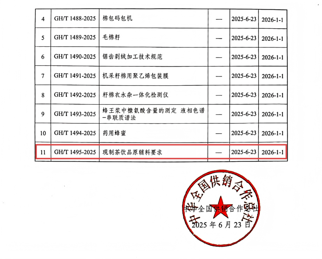 近日,由中华全国供销合作总社指导,中国茶叶流通协会(以下简称中茶协)组织制定的行业标准《现制茶饮品原辅料要求》(GH/T 1495-2025)正式发布。该标准将于2026年1月1日起正式实施。