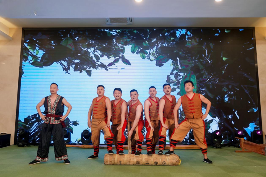 推介会在粗犷豪迈的安化千两茶号子声中拉开序幕。这支源自资水河畔的古老茶工号子,瞬间将现场观众带入雪峰山麓的云雾茶山。活动现场以“鎏金丝带”为喻,串联起安化百年千两茶柱与上海外滩建筑群,开启了一场跨越山海的文明对话。