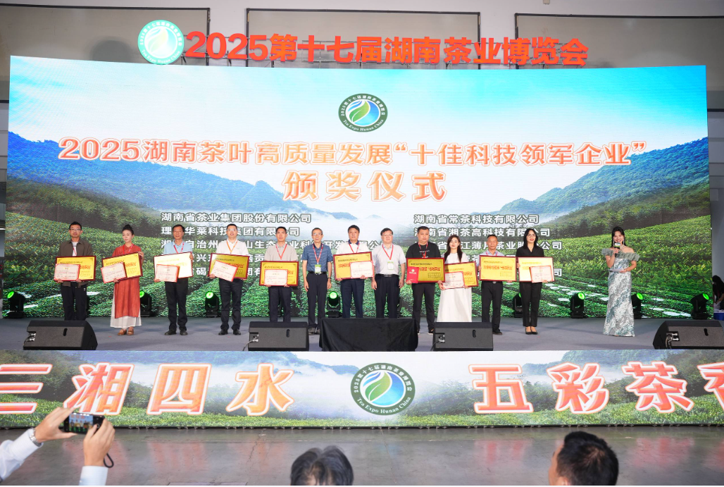 中国茶叶流通协会副会长、湖南省茶业集团股份有限公司党委书记、董事长周重旺等领导颁发2025湖南茶叶高质量发展“十佳科技领军企业”